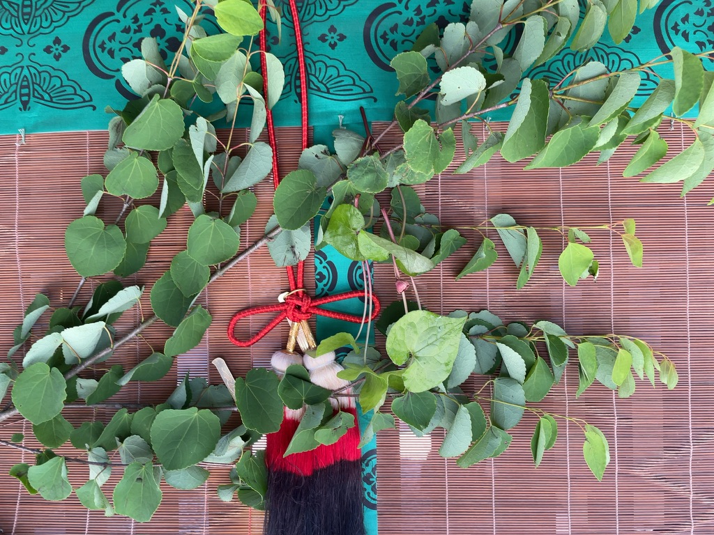 桂の枝の真ん中あたりに「ふたば葵」を取り付けて、飾ります。