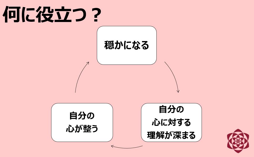 つまり、「穏やか」⇒「心を俯瞰」⇒「心が整う」⇒「さらに穏やか」・・・とグルグル回りながら少しずついい感じになっていく、いわゆる好循環が起こるのです。