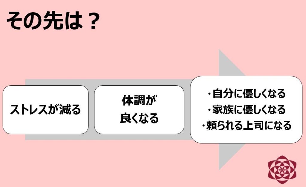 その先にでは、受講者がどんな環境で何を望んでいるか、という個々の状況によって変わってきますが、よく聞くのが「自分に優しくなった」「家族に優しくなった」「部下から相談されるようになった、部下とのコミュニケーションが良くなった」などです。