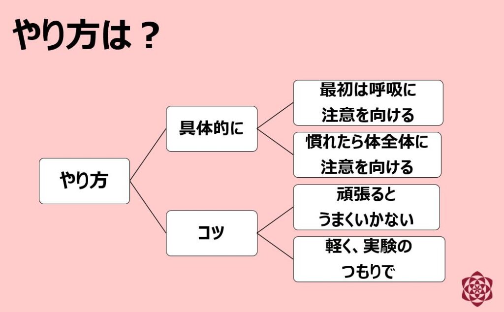 ここまで、マインドフルネスとは何か、について、お話ししてきました。ここからは、マインドフルネスとは具体的に何をすることなのか、なにかコツはあるのか、ということについてお話ししていきます。